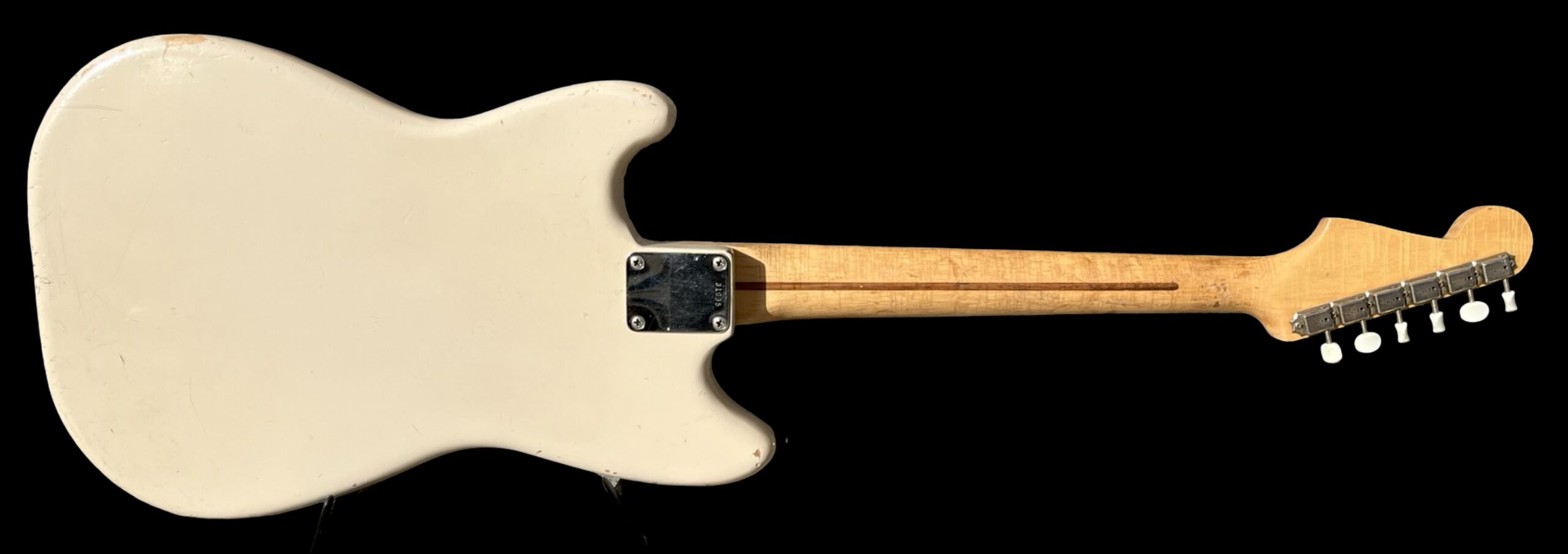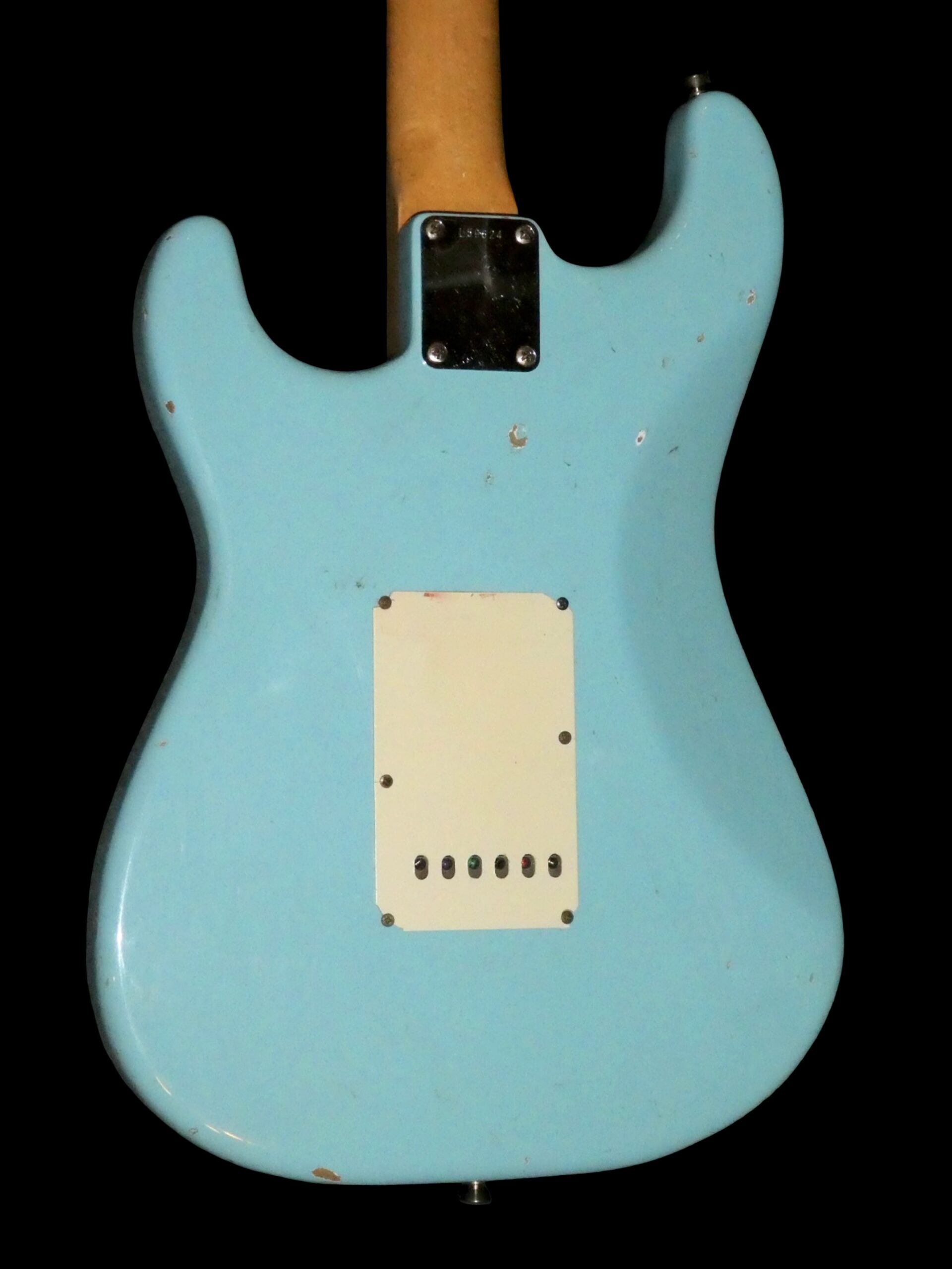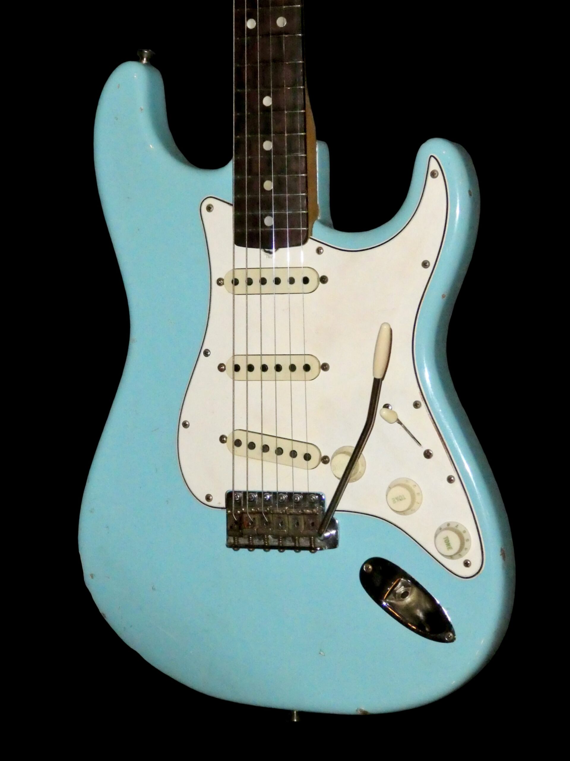 Daphne blue refin / Original feb 1965 neck / Original pickups dated 5-24-65, one rewound / Original tuners, pickguard, pots and switch / Weigh 3,4 kg / Replaced briddge saddles and has had an extra string tree / Comes with original case