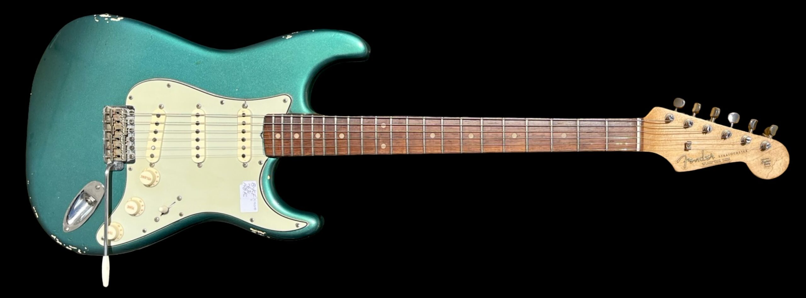 Fender Stratocaster from 1962 refin in Sherwood Green ( nitro-cellulose laquer). Original Kluson single-line tuners, Original green-guard. Two pots dated 3046232, replaced volume pot. Original switch. Three original black pickups. Weight 3,4 kg. Comes with original case.